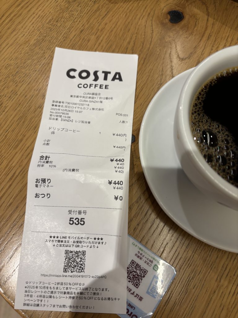 コスタコーヒーは、ヨーロッパで店舗数No.1のカフェブランドで1971年にイタリア出身のコスタ兄弟がイギリス・ロンドンで創業。2018年には、コカ・コーラ社によって買収され、2023年にコスタコーヒー CIRCLES渋谷店が1号店としてオープン。2025年10月26日現在では東京を中心に計12店舗オープンしているようです。(世界30カ国で4100店舗以上を展開中)