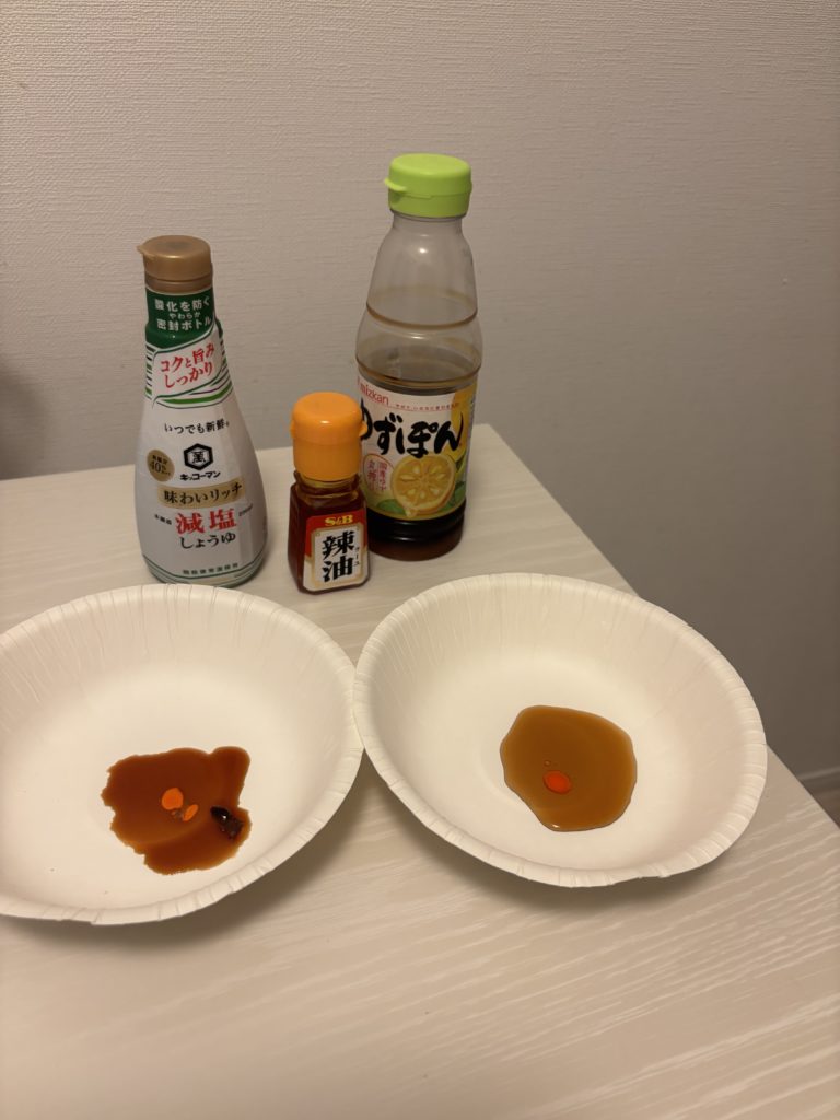 しょうゆとゆずぽんで試しましたが、僕的には醤油+ラー油が好みですかね。